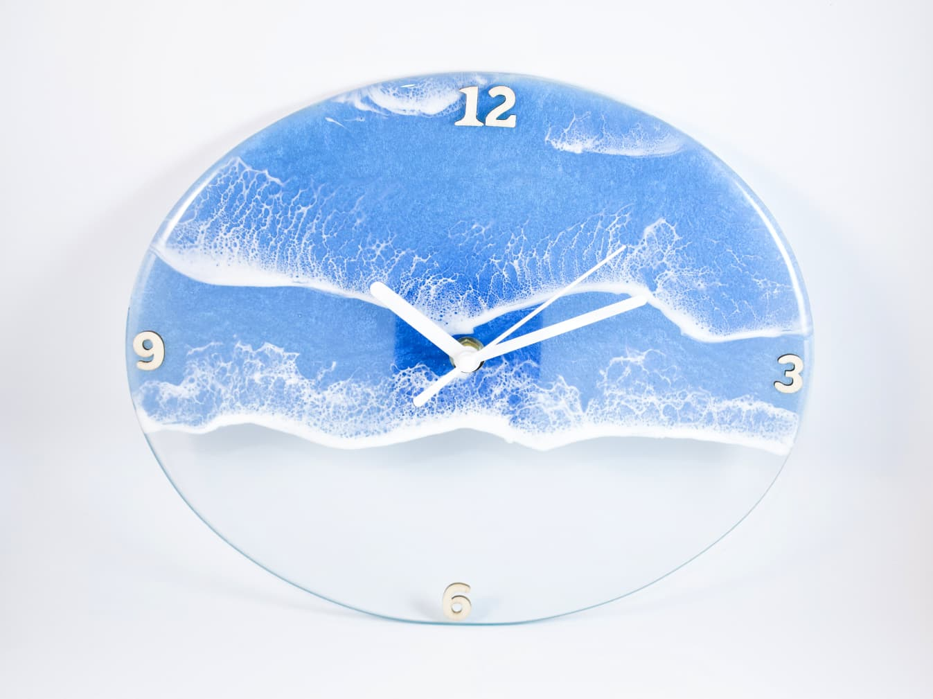 Lasă-te inspirat de liniștea mării cu acest ceas de perete artistic, realizat manual de un artist plastic român. Fiecare piesă este unică – creată prin turnarea manuală a rășinilor epoxidice pe sticlă, în nuanțe vibrante de albastru oceanic și alb spumos, ce evocă valurile ce se sparg ușor pe țărm.