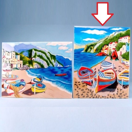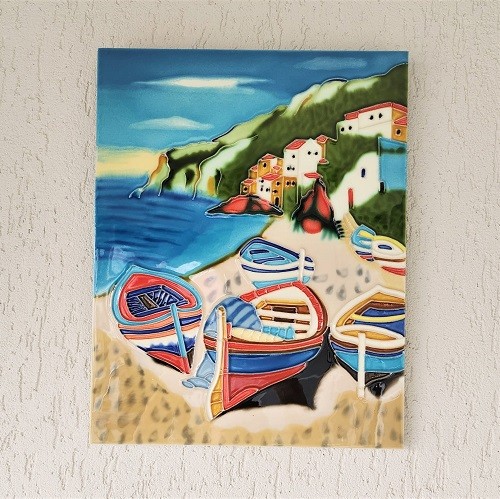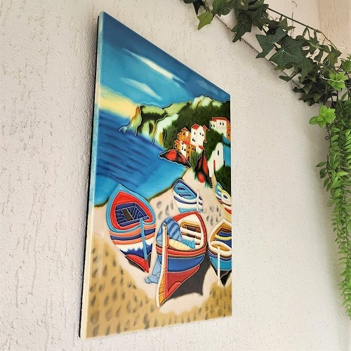 Tablou in format portret din ceramica cu tematica marina, reprezentand mai multe barci colorate pe o plaja stancoasa.
