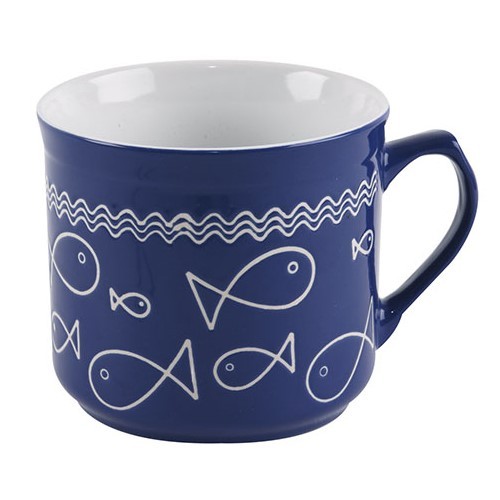 Cana mare din ceramica albastra, avand ca imprimeu pestisori albi stilizati