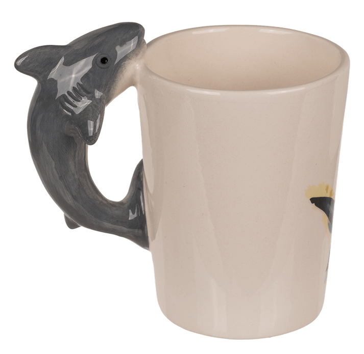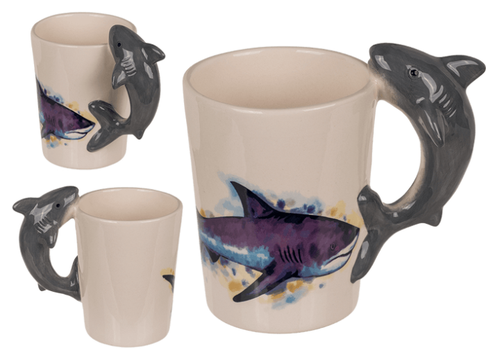 Cana din ceramica de 300 ml, cu maner 3D in forma de rechin si ilustratie marina. Vine in cutie de carton, ideala pentru cadou.